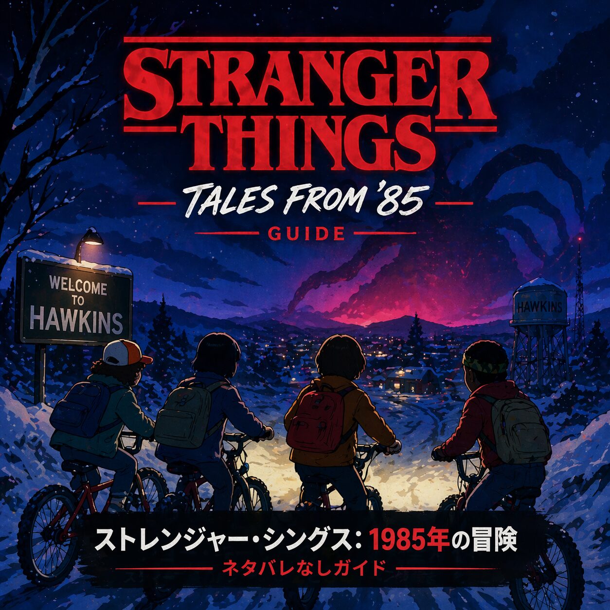 『ストレンジャー・シングス: 1985年の冒険』は、Netflixの大ヒットドラマ『ストレンジャー・シングス 未知の世界』から生まれたアニメシリーズです。英題はStranger Things: Tales From ’85。実写本編の世界観をそのまま使いながら、アニメならではの表現でホーキンスの新しい物語を描いています。